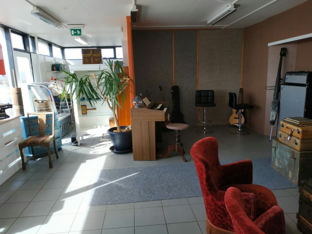 Allí a lo lejos de divisa una guitarra y unos cuantos instrumentos más, parece un rinconcito de ensayo.