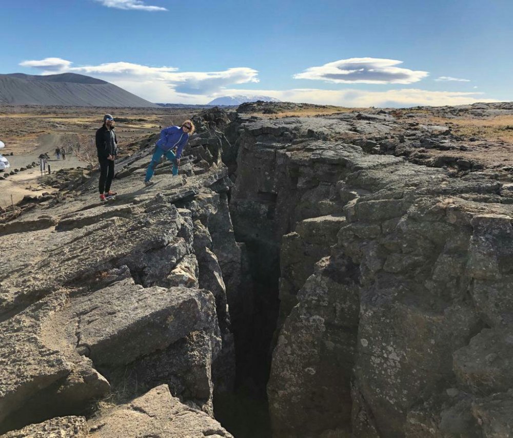 Encima de la cueva hay una grieta. Es una grieta donde la lava surge a la superficie cuando hay erupciones en Leirhnjukur o Krafla.